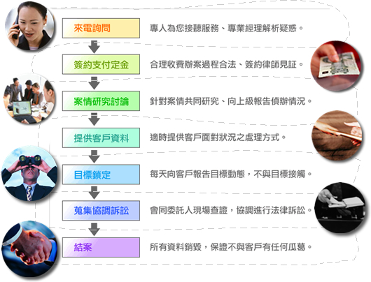 完善的徵信流程可以避免很多案件上的糾紛,更可以幫助委託人了解辦案的程序,一間好的徵信社一定會把整個徵信流程分成前、中、後三期,前期的徵信與了解,中期的調查蒐證,以及後期的收尾與協調等,具備完善的徵信流程,才能有良好的服務品質。